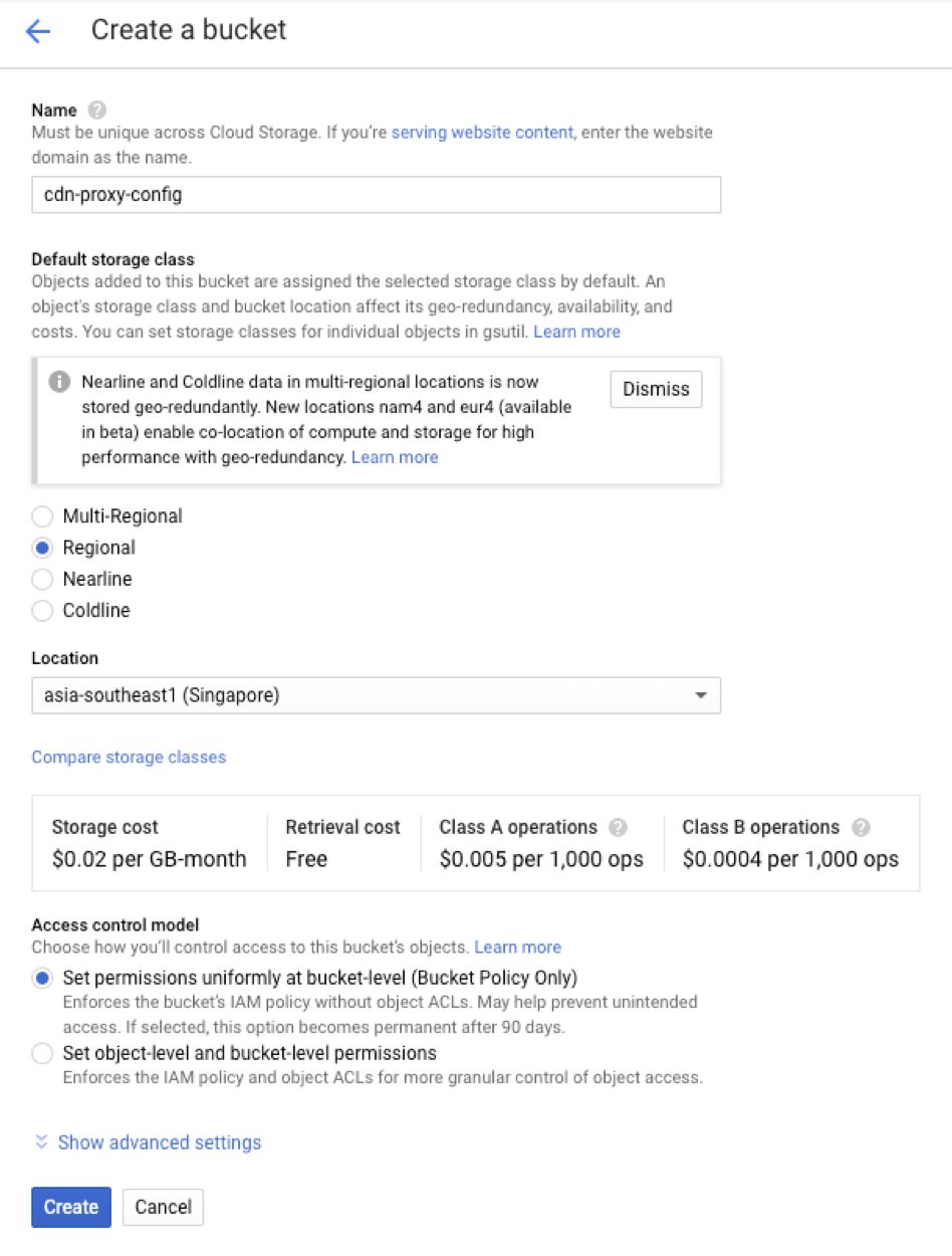 首先创建一个 Cloud Storage 的存储桶,用来存放代理服务器配置文件。