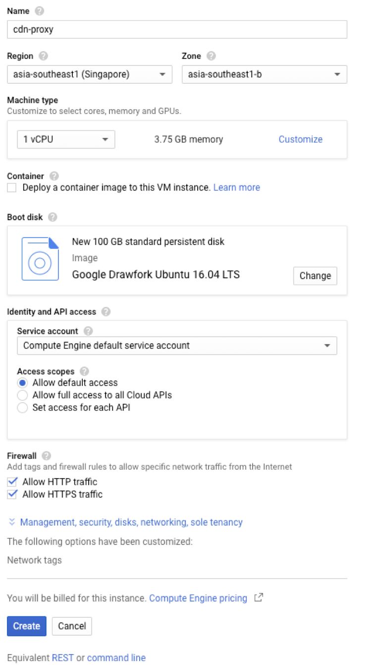 3. “Firewall”勾选”Allow HTTP traffic”和”Allow HTTPS traffic”; 4. “Networking”中的“Network tags”填写“cdn-proxy”;