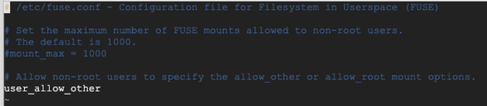 修改 /etc/fuse.conf,将”user_allow_other”前面的注释符去掉。