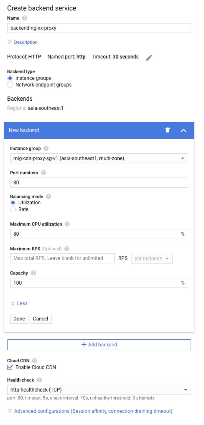 在新建的 Backend service 配置中选择之前创建的 Instance group,勾选“Enable Cloud CDN”,并选择之前创建的 HTTP 健康检查。