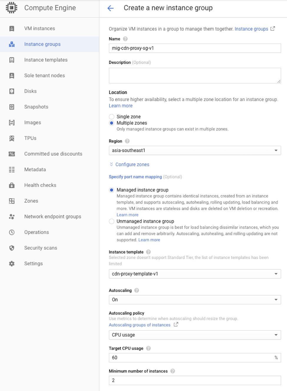 Location 选择 Multiple zones Region 选择离源站最近的区域,比如新加坡为 asia-southeast1 Instance template 选择上一步创建好的模板 Minimum number of instances 根据预估用量选择机器数量,比如 5000 QPS 可以选择 5 台